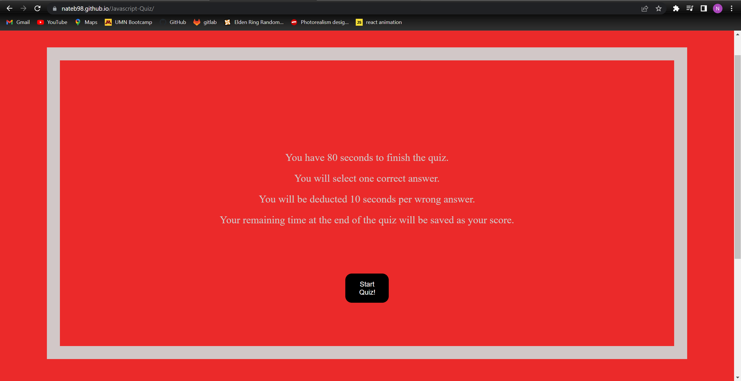 this is one of my first few projects I have made. A timed quiz on some javascript knowledge. the quiz has a timer that starts upon pressing the start quiz button and you are given 80 seconds to complete the quiz but you will lose 10 seconds of time for an incorrect answer. your score is the time you have left remaining after the last question or you lose and can start again if you run out of time. your high score is displayed after typing your name or initials.