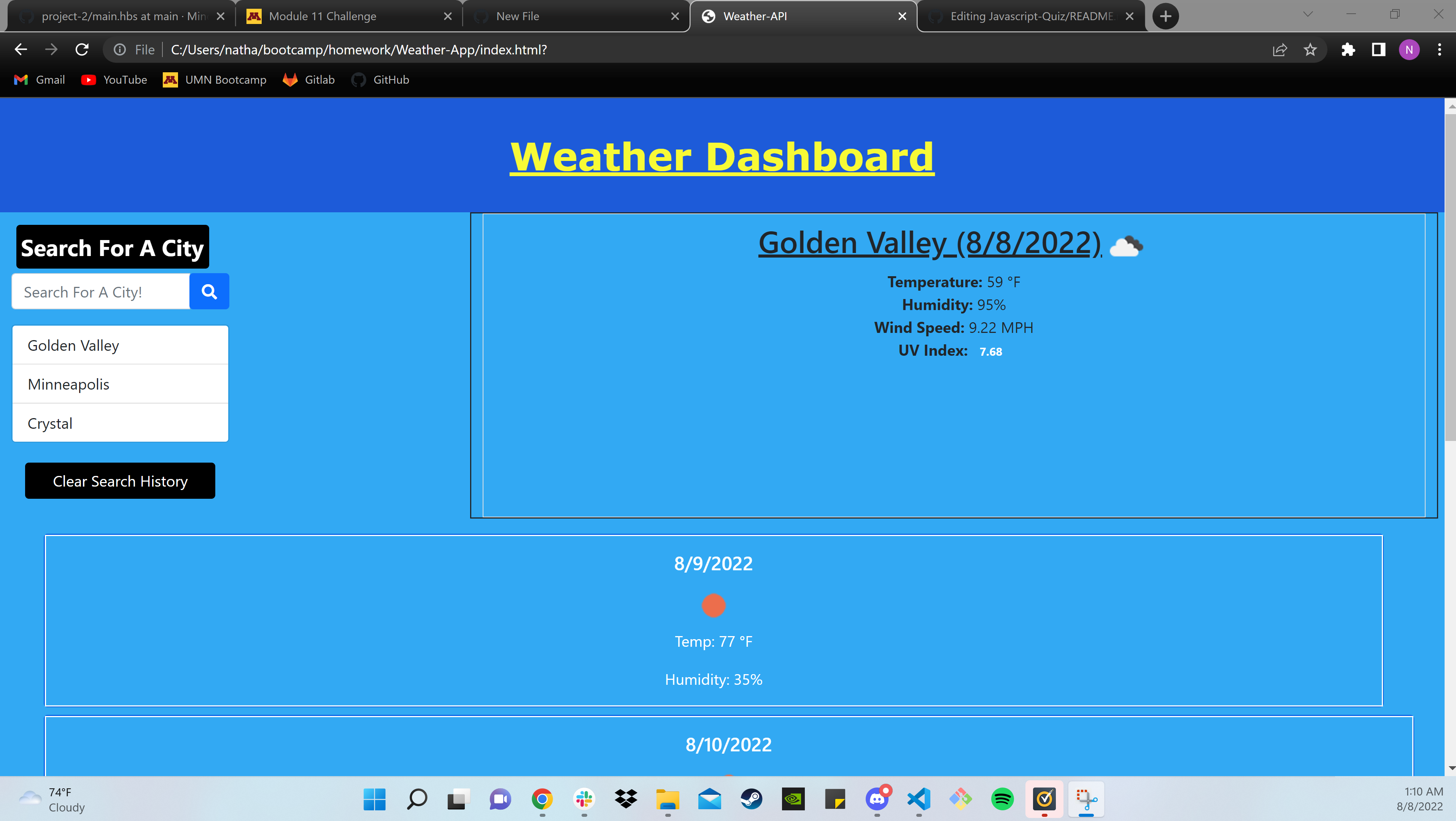 This is a 5 Day Weather forecasting app using the openweather API. this works by typing in a city within the search bar and it will display the current dates weather and display the next 5 days of that cities weather. this app will store the past cities you searched and there is a button to clear the past searches.