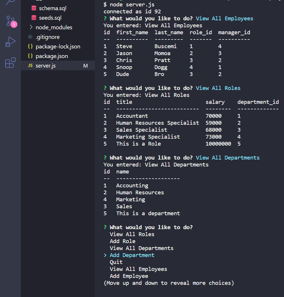 I have created an employee tracker using node.js along with mysql2, inquirer, and console.table. In order to run this you need to source the schema, then use the database, after switching to that database, source the seed file path and follow that with node server.js and it will open the prompt for you to choose to view all employees, add and employee, update employee, view all roles, add a role, view all departments then add a department or just quit. selecting any one other than quit will result in more prompts for input and it will take your input to generate new items into the database.